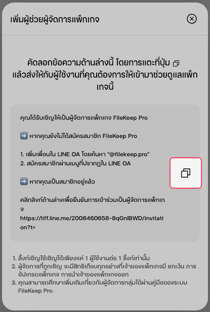 ระบบ FileKeep Pro เปิดโอกาสให้เจ้าของแพ็กเกจ สามารถเพิ่มผู้ดูแลได้ โดยที่ผู้ดูแลนั้นจะมีสิทธิ์ในการดำเนินการต่าง ๆ กับแพ็กเกจ เหมือนกับเจ้าของแพ็กเกจ เพียงแต่จะไม่สามารถอัปเกรด หรือเปลี่ยนแปลงแพ็กเกจที่ใช้งานได้